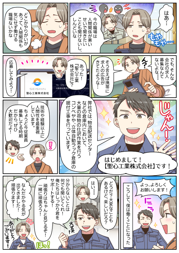 聖心工業株式会社は物流倉庫などのコンベヤや立体自動ラック倉庫の据付工事を行っている会社です。都内を中心に多くの倉庫、工場などから依頼をいただいており、安定した業務量があります。今後も取引先の期待に応えられるよう、組織体制の強化に伴い、新メンバーを募集することになりました。教育体制も整っており、未経験の方でも一から丁寧に指導を行いますのでご安心ください。前向きで真面目に取り組んでくださる方のご応募お待ちしております!